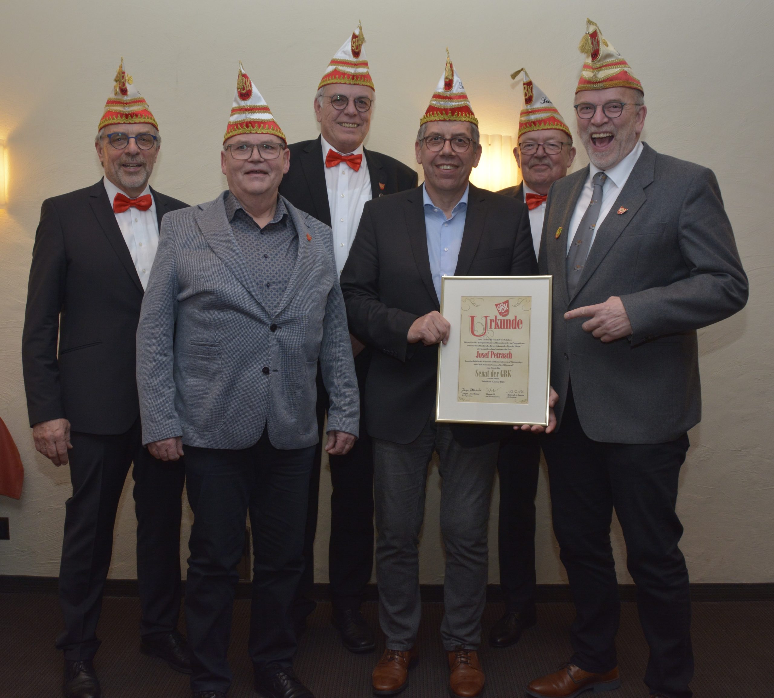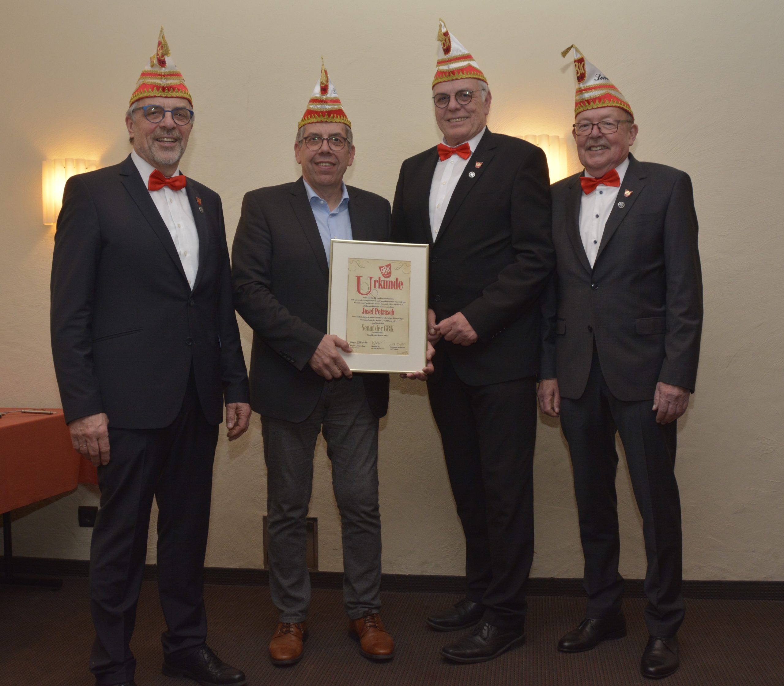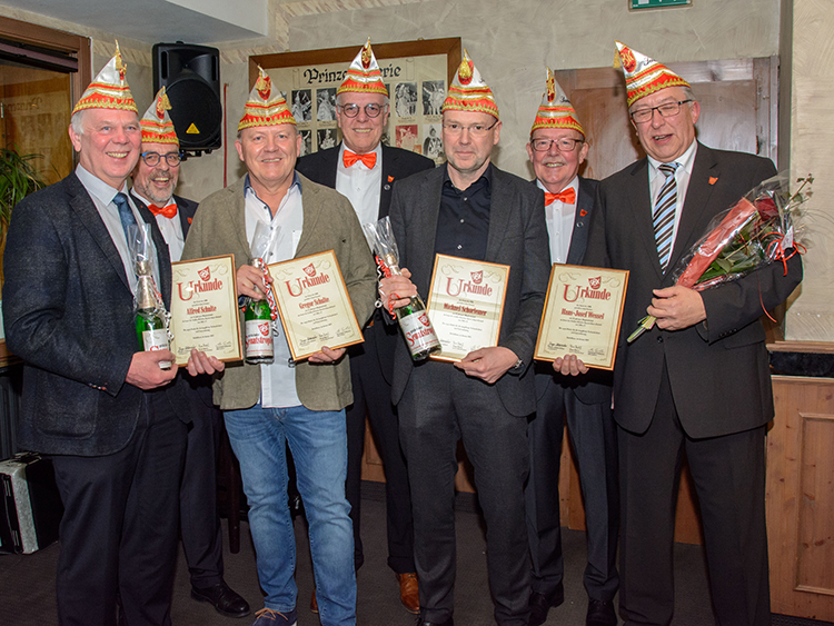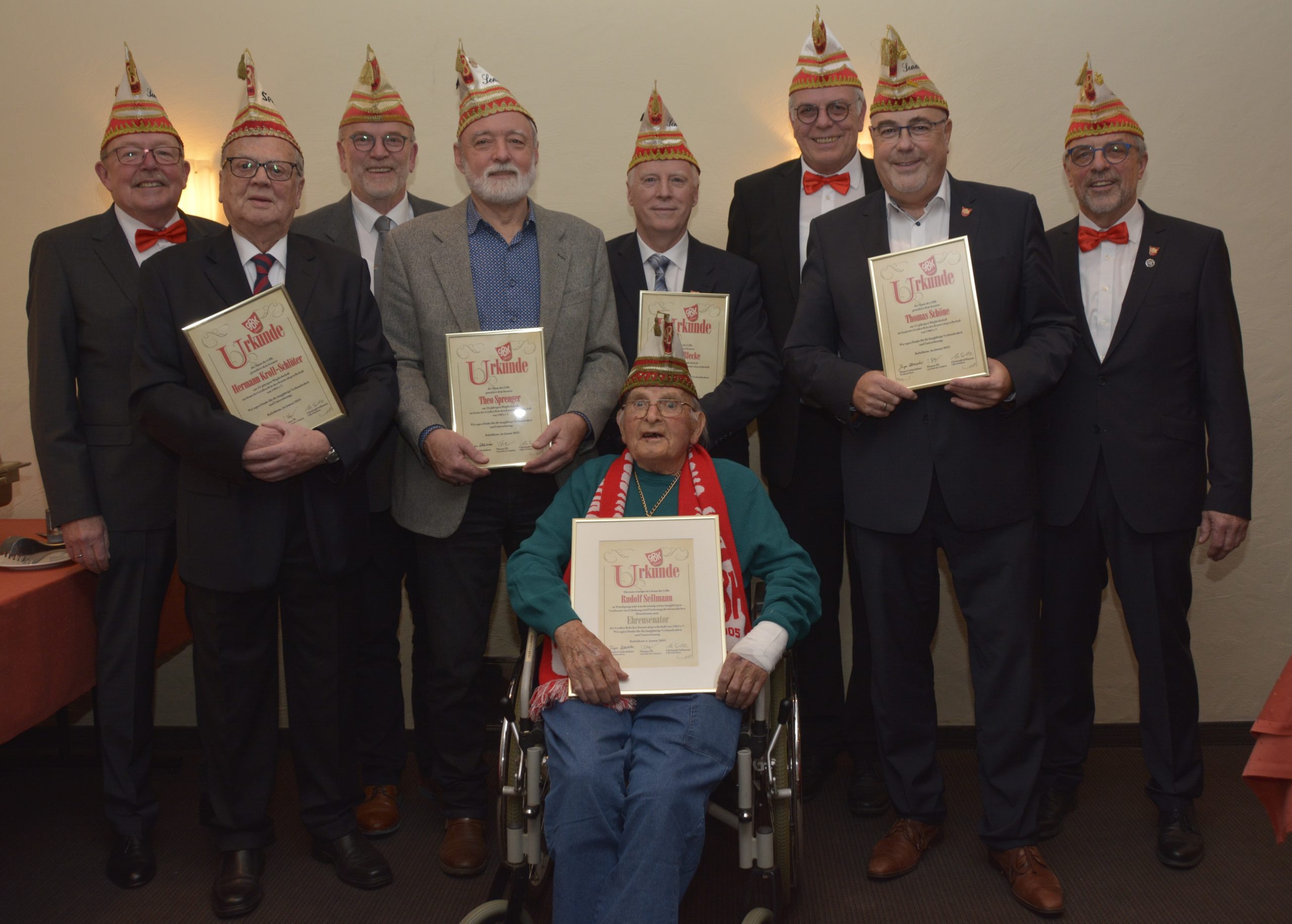 Der Senatsvorstand Jürgen Lütkeduhme, Martin Peters und Siegfried Schenuit konnte in diesem Jahr insgesamt sieben Senatoren für ihre langjährige Verbundenheit und Unterstützung des Belecker Karnevals mit prickelndem GBK-Senatstropfen, einer Urkunde sowie einer roten Rose für die Damen der Jubilare geehrt werden. Rudolf Sellmann wurde auf Grund seiner 44jährigen Zugehörigkeit im Senat zum Ehrensenator ernannt.