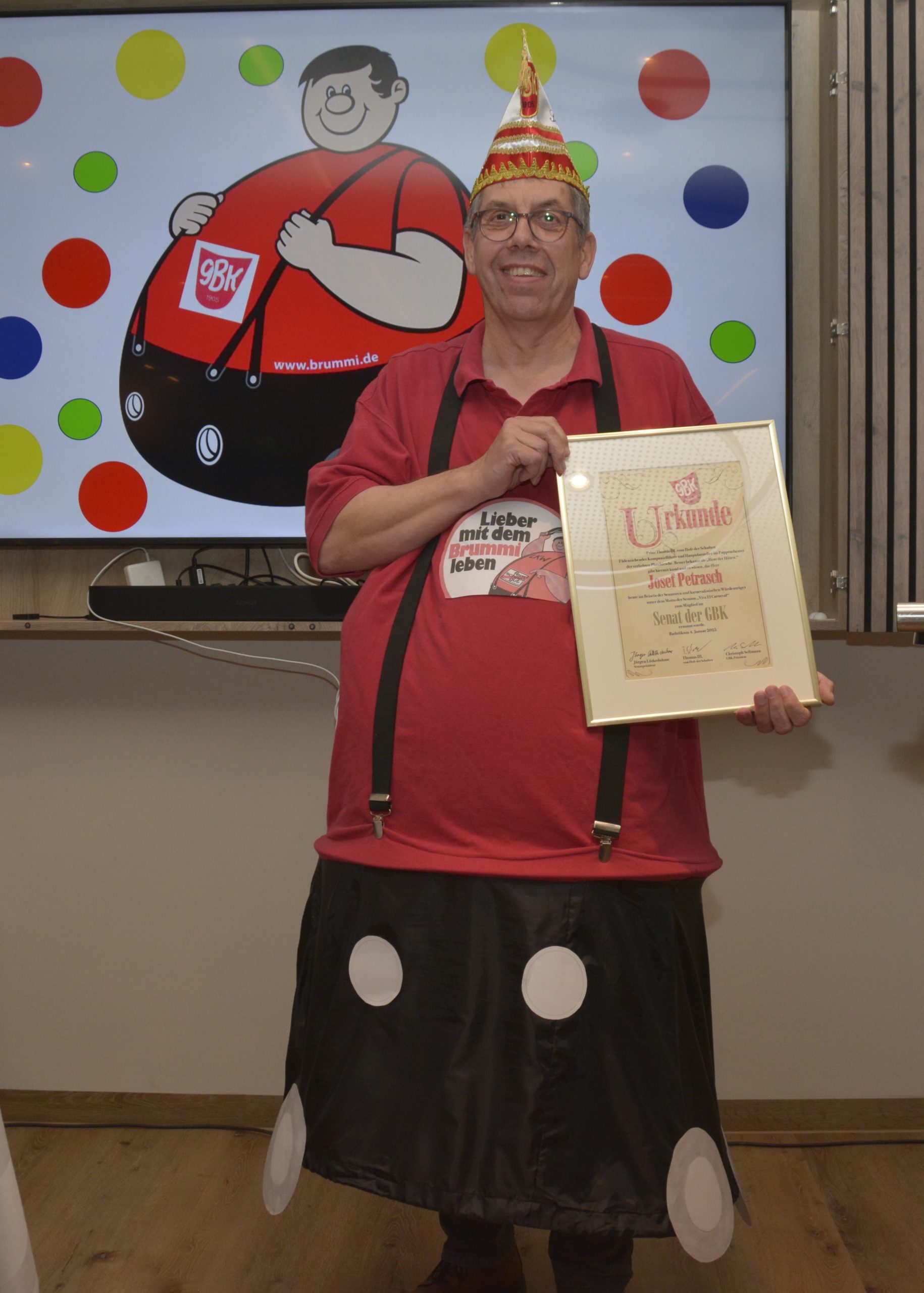Der Höhepunkt dieser Veranstaltung war in diesem Jahr die Taufe des Senatsaspiranten Josef (Brummi) Petrasch. Als langgedienter Karnevalist, er fuhr schon im zarten Alter von12 Jahren selbstständig einen LKW im Rosenmontagszug, sowie weiterer karnevalistischer Stationen in JuKa und GBK musste er in Teilaufgaben seine Bewährungsprobe fehlerfrei bestehen. Die Taufpaten Uli Hoppe und Wilfried Steimann hatten ihm knifflige Aufgaben übertragen, die es vor der Aufnahme in den Senat zu lösen galt. Nach einem, von ihm selbst vorgetragenem karnevalistischen Lebenslauf galt es, im „OrdensJahrgangPrinzen – Quiz“ älteren Karnevalsorden das jeweilige Motto, das Jahr sowie den Prinzen zuzuordnen.