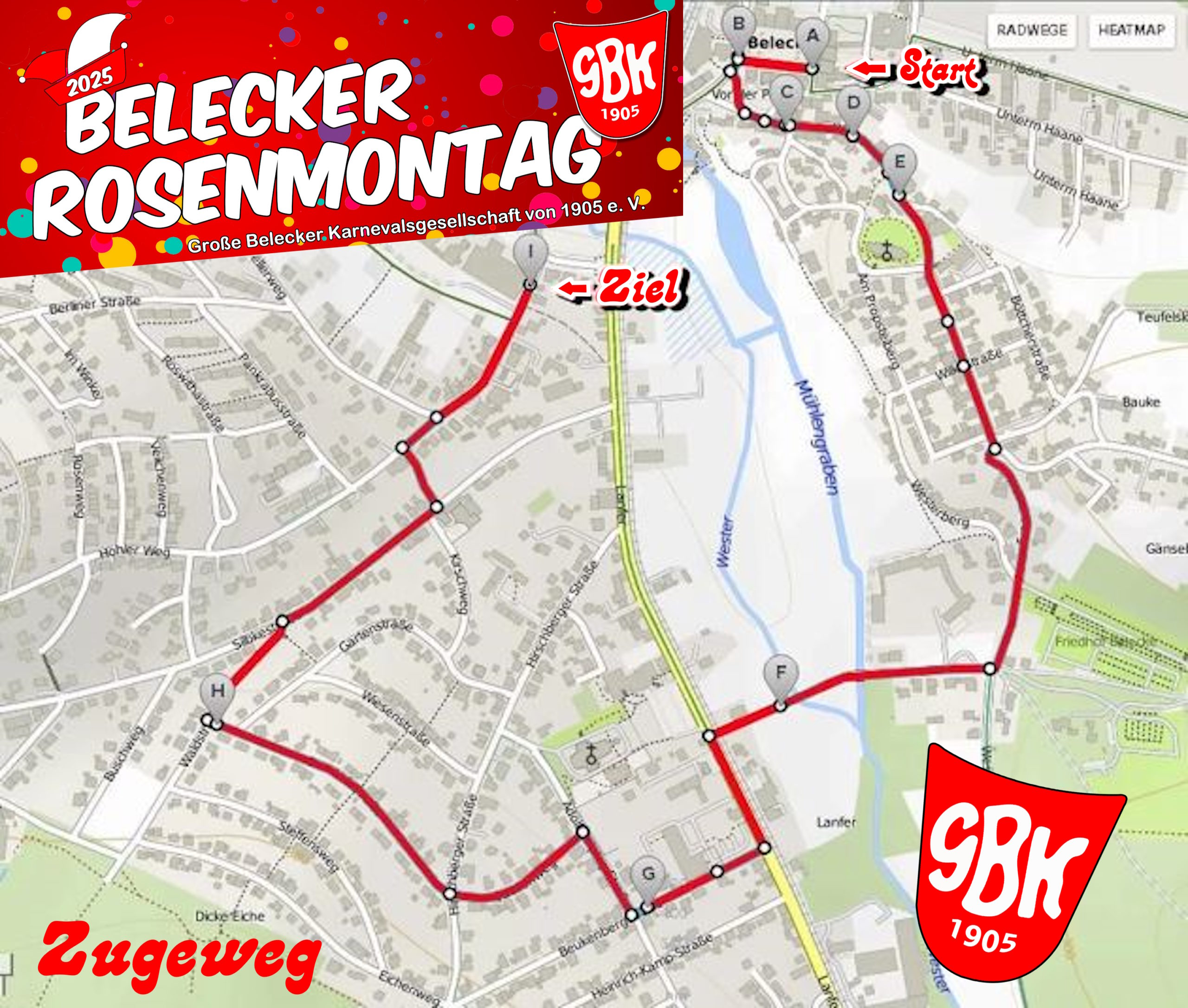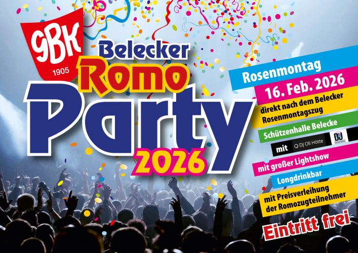 Der 1,5km lange Zug schlängelt sich die knapp 4,5km lange Strecke quer durch den Ort. Lustiges und Wissenswertes über alle Wagen und Fußgruppen erfahren die Zuschauer in der Wilkestraße, am Gasthof Hoppe, sowie an der Ecke Hohler Weg/Sellerberg von den Kommentatoren aus den Reihen des GBK Senats und des runden Tisches. Nach dem Umzug startet die große ROMO-Party in der Belecker Schützenhalle, zu der jeder herzlich eingeladen ist. Der Eintritt ist FREI! Für die richtige Stimmung sorgt DJ Olli Hötte. Alle Informationen rund um den Belecker Rosenmontagszug findet ihr hier: