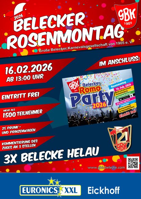 Der Rosenmontagszug in Belecke ist einer der größten im gesamten Sauerland und darüber hinaus. Der Zuwachs aus aktiven Karnevalisten aus den Nachbarorten nimmt stetig zu. Über 1500 aktive Karnevalisten, 20 große Motto- und Prinzenwagen sowie 3 Musikkapellen sorgen jedes Jahr für ein Riesenspektakel, wenn am Rosenmontag in Belecke um 13:00 Uhr der Startschuss fällt.